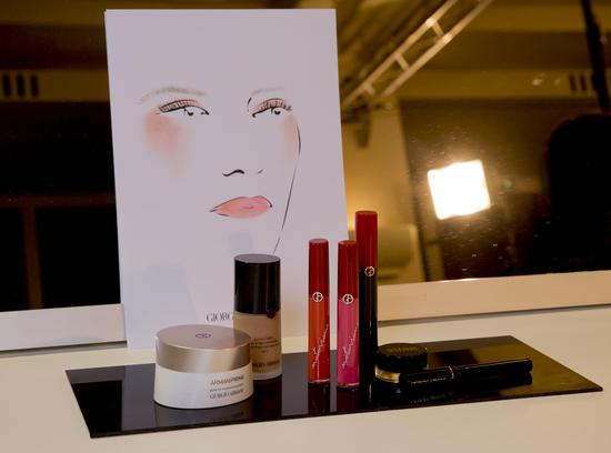 步骤呢则是和一般彩妆步骤类似,先以阿玛尼‘光钥新肌’柔光水润霜进行妆前打底,加以按摩静待面霜充分被肌肤吸收后,再进行后续底妆的加持◁;底妆选取全新阿玛尼无痕遮瑕乳与无痕持妆粉底液进行调整与修饰,让脸部与脖颈肤色完美一致,宛若天生般自然。眼部和颧骨处,选取全新阿玛尼红管唇釉(#301),以大面积晕染的方式进行橙色的叠加●△◇;眼部妆容则依靠阿玛尼臻致造型美眸膏#2、全新阿玛尼决战时尚大师眼线液以及全新阿玛尼黑色魅眼浓情睫毛膏来完成;唇部采用全新阿玛尼红管唇釉#301 与 #515 进行混合来完成,最后用粉饼定妆~