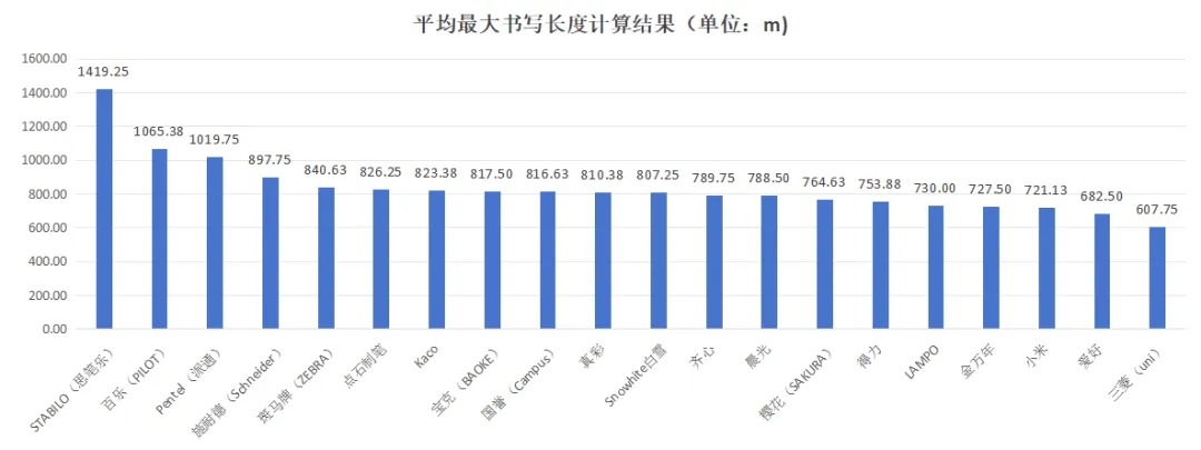 结果显示:20款中性笔在书写测试时…-◆,直至墨水用尽未出现线迹断线、变淡等书写异常的情况。平均最大书写长度在607.75米~1419.25米之间-▷,数值越大,表现越好。