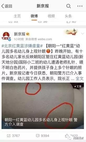 北京朝阳区红黄蓝幼儿园新天地分园国际小二班的幼儿遭遇老师扎针、喂不明白色药片等情况,并提供了孩子身上多个针眼的照片。