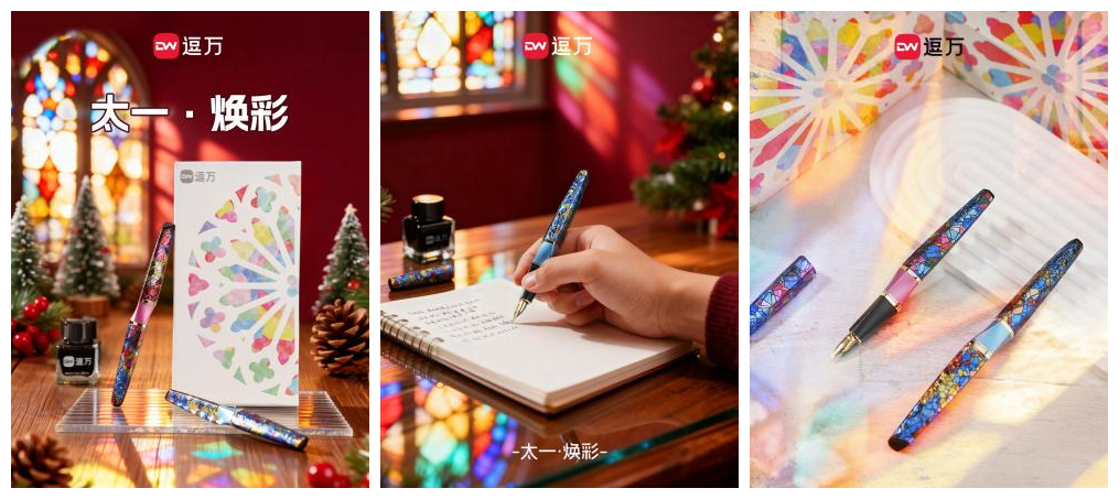 逗万太一・焕彩创新性地将彩绘玻璃美学融入笔身创作,精心雕刻出模拟中世纪彩窗的立体边框与繁复几何花纹▪-△,指尖触碰可感知起伏质感,仿佛握住一件承载信仰力量的艺术品。光影穿梭于琉花脉络之间,金属流光与彩绘华彩交织辉映,让书写从单纯的文字记录升华为沉浸式艺术体验◁□。