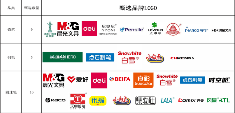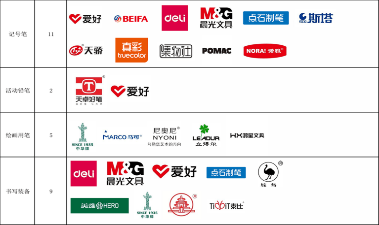 入选品牌覆盖铅笔、钢笔、圆珠笔▷★◆、记号笔、活动铅笔★-…、绘画用笔、书写装备七大核心品类◆。其中,铅笔品类有中华牌★、晨光等9个品牌▪;钢笔品类包含英雄、点石制笔等5个品牌▼▽;圆珠笔品类汇聚晨光、爱好、白雪等16个品牌;记号笔品类有爱好、贝发等11个品牌●◁;活动铅笔品类入选的是天卓▪、爱好2个品牌;绘画用笔品类包括中华牌…◆、马可等5个品牌○;书写装备品类则有得力、英雄等9个品牌,充分展现了我国制笔行业品牌建设的多元活力与综合实力●○▲。