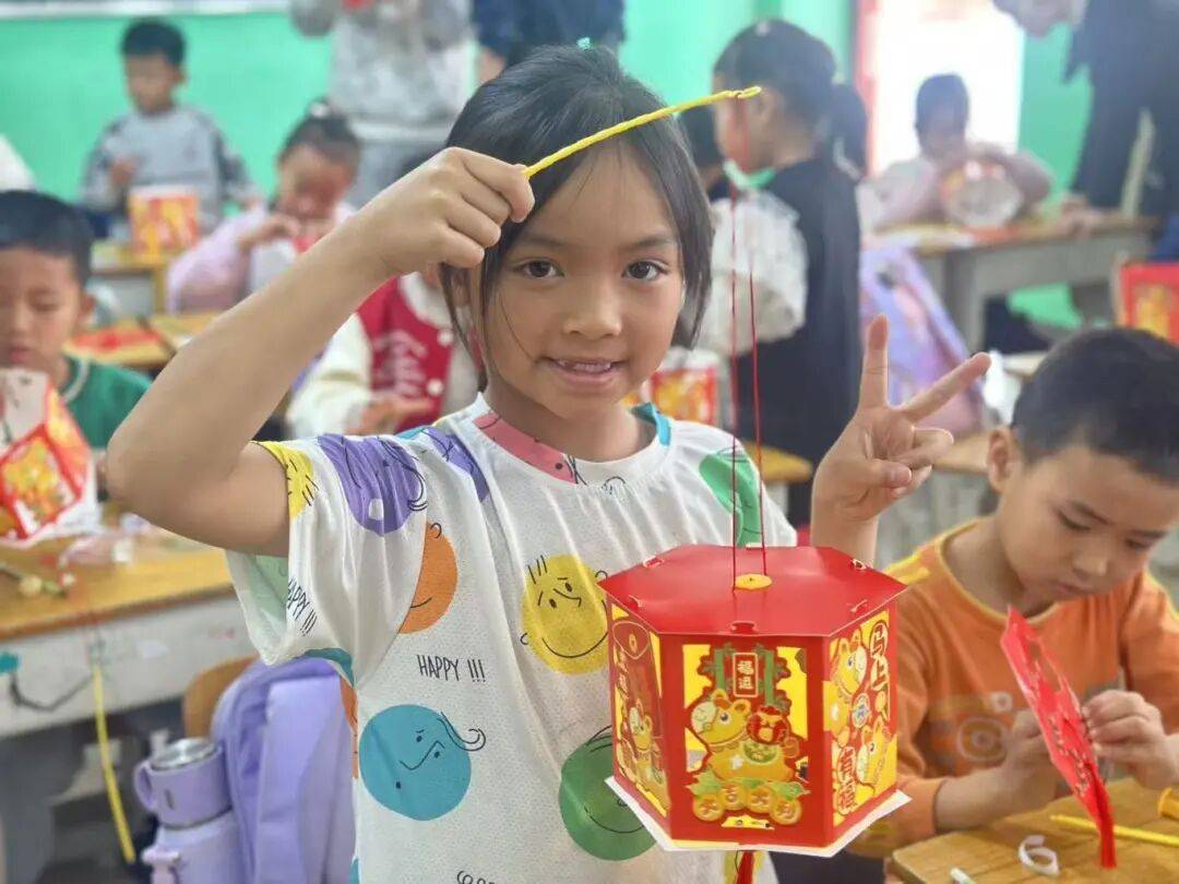 随后的手工创作环节充满欢乐与创意▼。志愿者与孩子们分组合作,拿起精心准备的新年灯笼材料包、心愿卡和彩笔,有条不紊地进行手工制作。孩子们专注地跟着志愿者的指导制作灯笼,细心调整细节=,让每一个灯笼都完整呈现出喜庆模样◆▼•。与此同时,孩子们在心愿卡上写下 ◇◇“新年要多读书”“希望和小伙伴天天开心☆” 等纯真愿望,志愿者在一旁帮忙装饰点缀,让心愿卡更显精致。展示分享时▷,孩子们自信地介绍自己制作灯笼的过程与心愿,清脆的笑声回荡在校园里,最后孩子们手持灯笼和心愿卡与志愿者们合影,定格这份冬日温暖。
