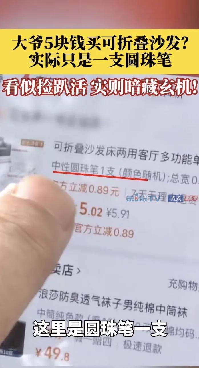 商家以“5元折叠沙发”作为主图宣传●●,但实际售卖的商品为圆珠笔。律师指出,5元的价格连沙发运费都无法覆盖,明显违背常理。此类商家通常通过设置超低价SKU(如0…▼.01元商品)提升搜索排名,再利用主图与默认选项不符的方式诱导下单,形成“引流陷阱”▽。目前购物平台表示将会调查此事,如果发现卖家有违规行为,他们将进行严厉处罚•。