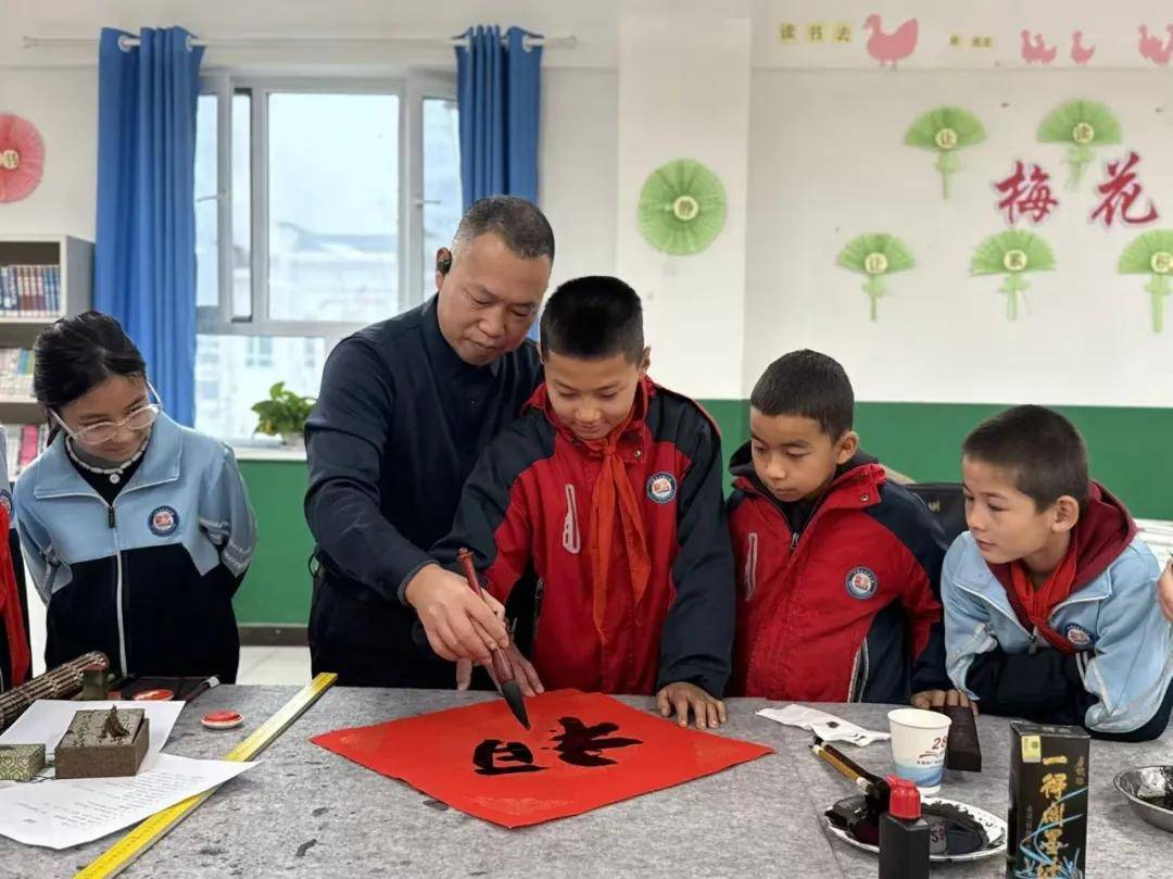 为传承中华优秀传统文化,营造喜庆祥和的迎新氛围,12月31日,沙雅县文学艺术界联合会组织书法家协会骨干走进沙雅县第四小学,开展-▽◇“墨香迎新年 文化润校园”书法进校园活动。以笔墨为媒•●,为师生送上别样新年祝福◇…,让翰墨书香浸润校园,助力青少年厚植文化自信。