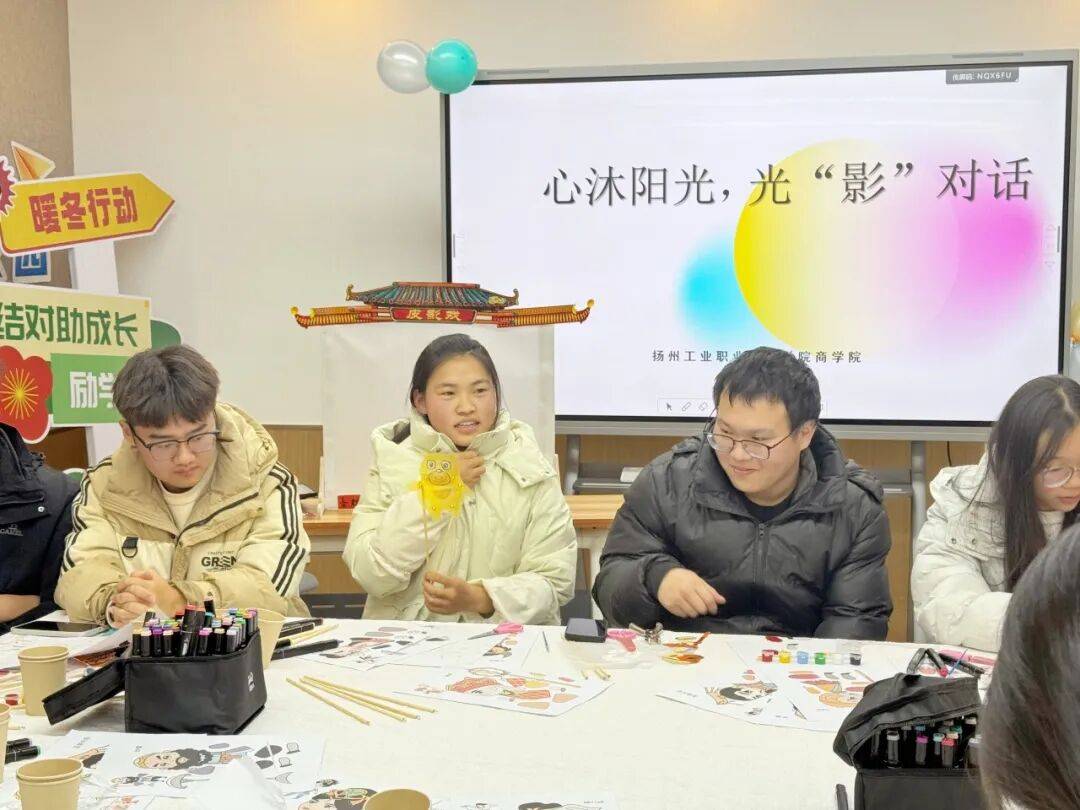 近日,扬州工业职业技术学院开展“心沐阳光,光‘影’对话”主题活动•◇,将传统皮影艺术与暖冬心理关怀相结合,为学子们带来了一场创意与温情兼具的互动体验。活动现场-◇,同学们围坐桌前,手持彩笔为卡通皮影图案涂色、用剪刀细致裁剪造型▽◆▲,再将成品固定在竹签上。这场活动是学校“暖冬行动★”的特色环节,既让学生近距离感受皮影这一传统民间艺术☆△,也以沉浸式手工创作的方式▪,为大家搭建了舒缓节奏、轻松交流的平台。