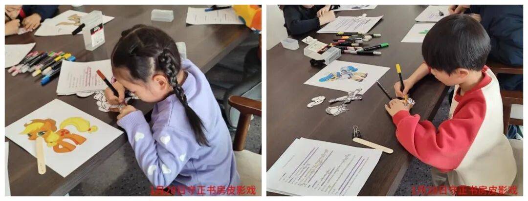 制作环节,小朋友们用水彩笔认真为小马图案涂色,现场热闹又有序。志愿者们穿梭其间,耐心帮涂完色的小朋友打孔、安装钉子,手把手指导操作技巧,还为不认识字的小朋友讲解剧本名称,及时化解创作难题,让每个孩子都能顺利完成专属皮影道具。