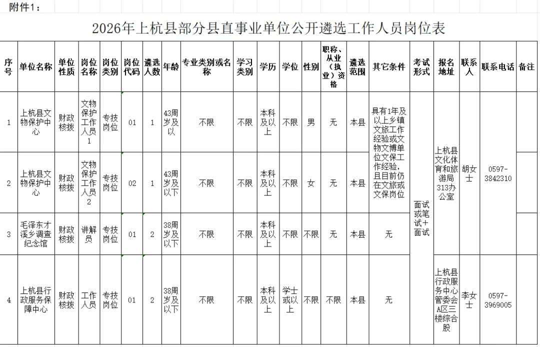 本次公开 遴选财政核拨事业单位工作人员6人,其中上杭县行政服务保障中心2人、上杭县文物保护中心2人、才溪乡调查纪念馆2人 ( 办公地点在乡镇 ) (详见附件1《2026年上杭县部分县直事业单位公开遴选工作人员岗位表》,以下简称《岗位表》 ) 。