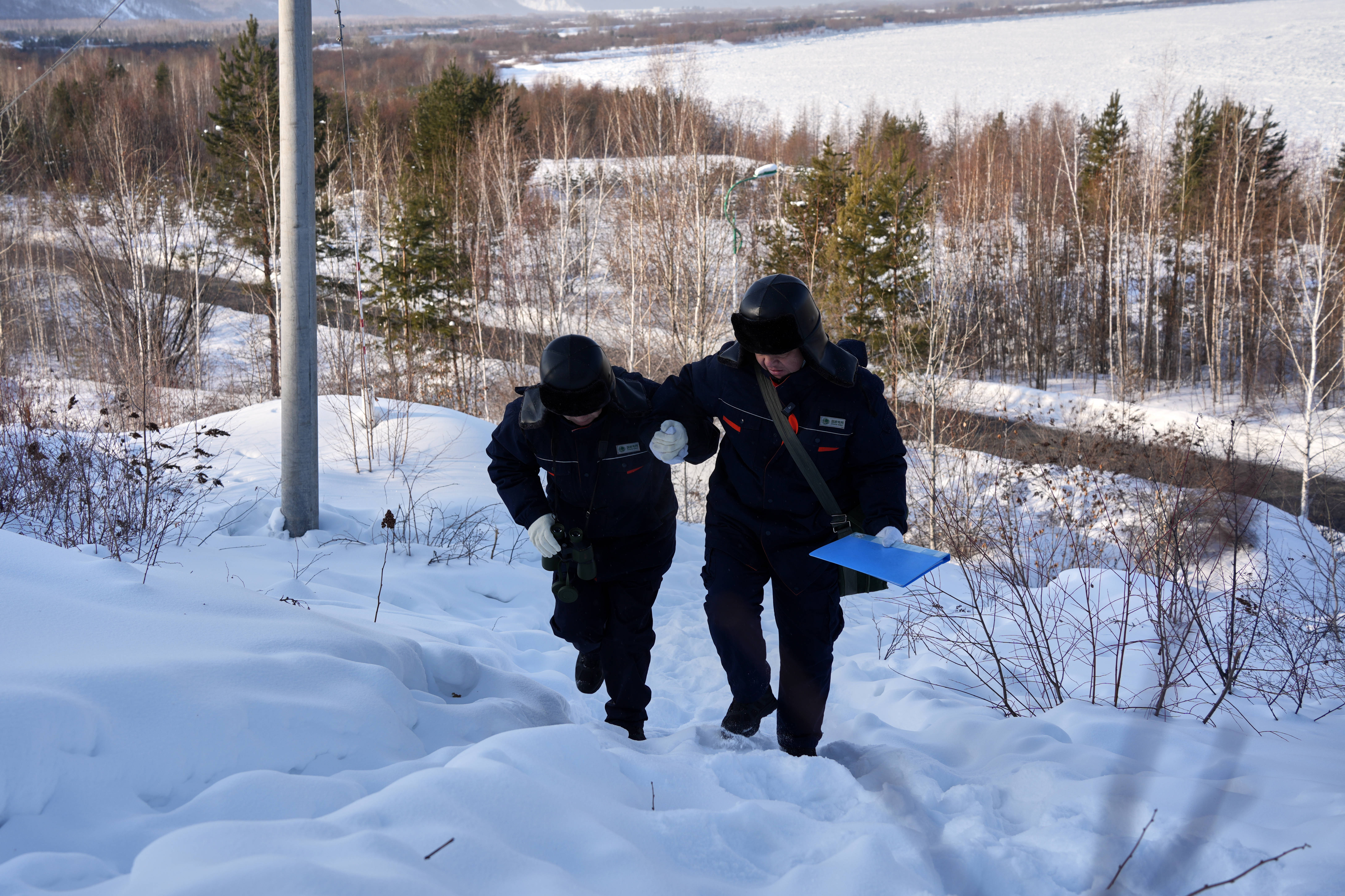 北极供电所负责北极村附近的7条供电线路,大多架设在山上的白桦林中。山虽然不算高,但走在齐腰深的积雪中,即便是经验丰富的吕建生,在和同事互相搀扶前行中,也难免滑倒,“不怎么疼,别让雪灌进衣服里就行。”吕建生从雪里熟练地爬起后,拍拍身上的积雪,向更深处走去。