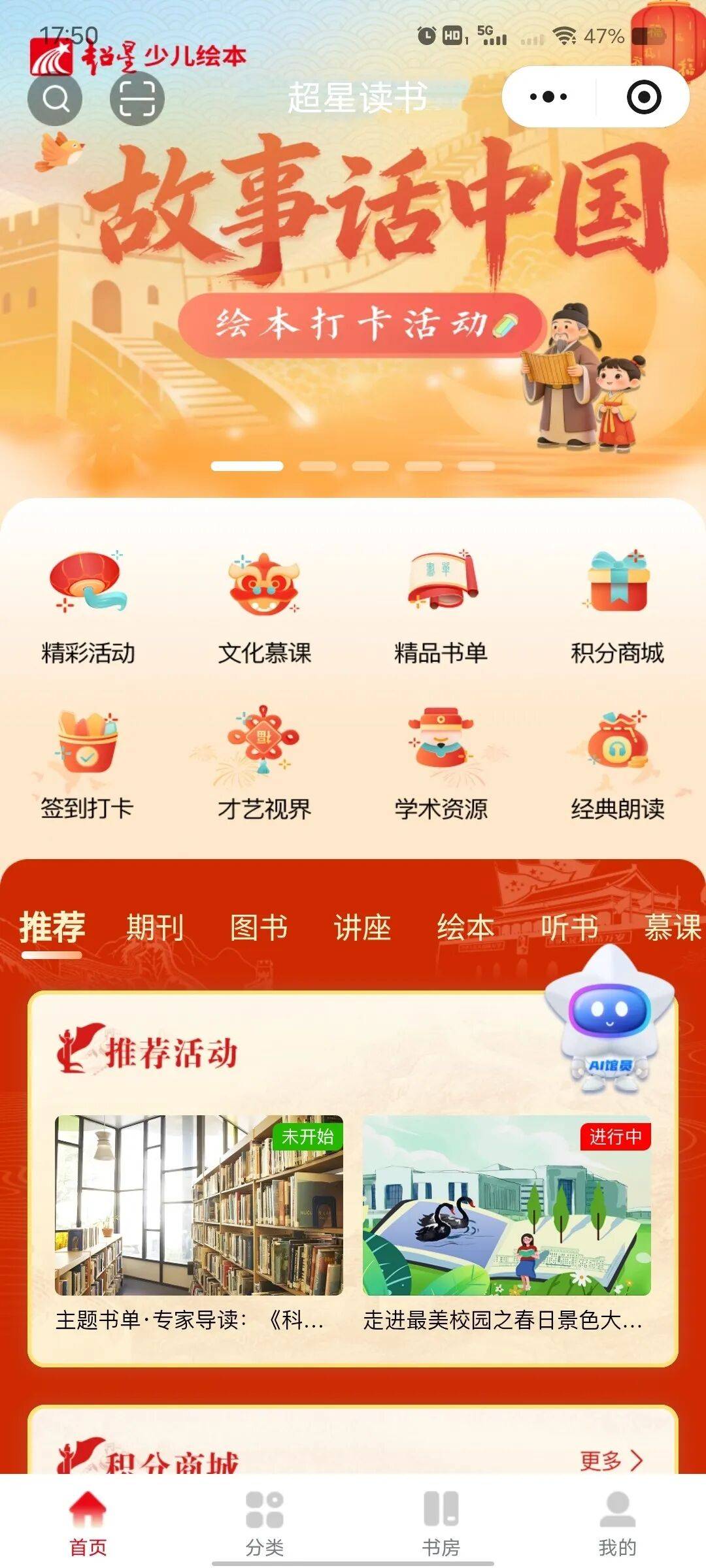 2. 以超星读书为例,选择图书馆并授权登录→点击首页轮播图进入活动页面。
